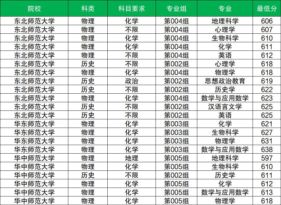 历史类招生专业组共计6个,分数在611分到625分不等,最低分专业组为华中师范大学第002组,最高分专业组为东北师范大学第002组。即历史类考生成绩至少超特控线118分才有机会就读部属师范院校公费师范生。