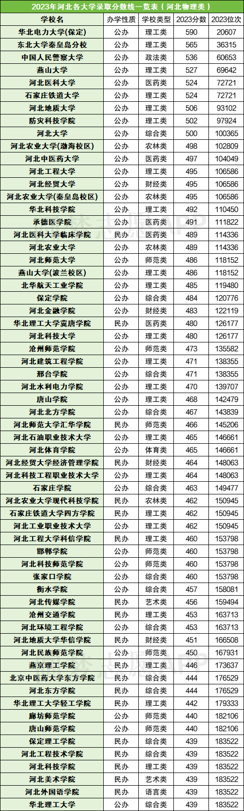 河北本科院校的最高录取线是590分,对应的是华北电力大学(保定),位次是20607;河北公办本科院校的最低录取线是439分,对应的是华北理工大学。
