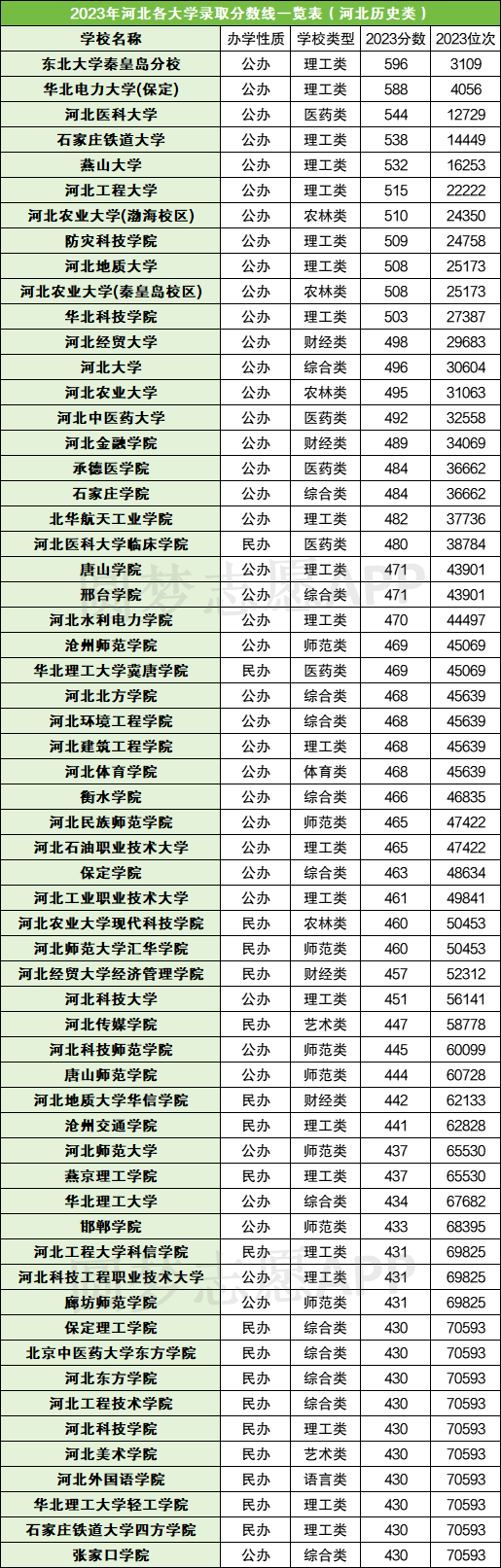 河北本科院校的最高录取线是596分,对应的是东北大学秦皇岛分校,位次是3019;河北公办本科院校的最低录取线是430分,对应的是张家口学院,位次是430分。