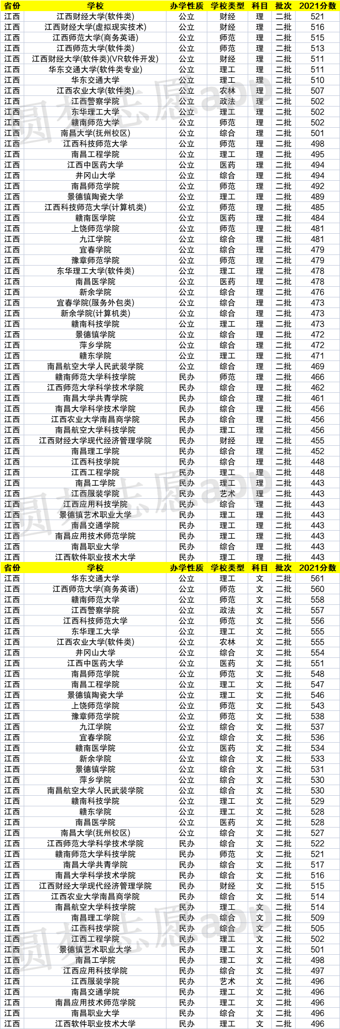 在文科考生中分数线最低的公办二本大学为南昌大学(抚州校区)的527分,其次为南昌医学院的527分。