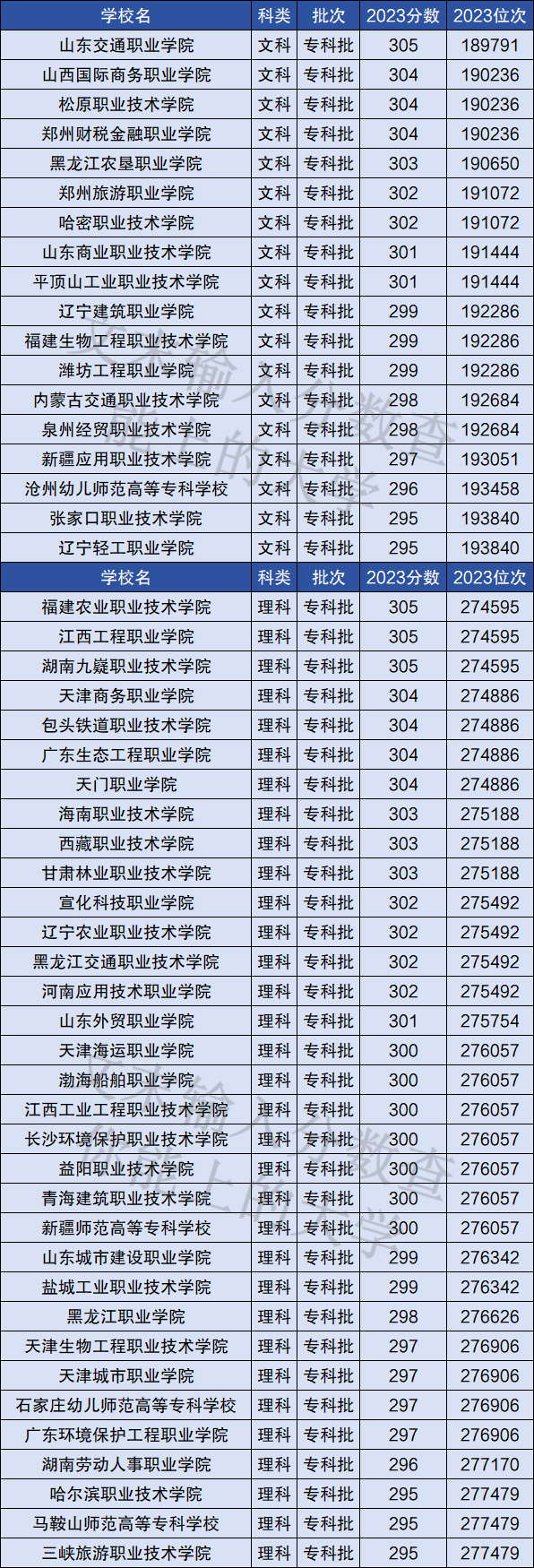 下面是2023年分数线在300分左右的公办专科学校名单一览(可滑动查看,更多大学分数线可在文章底部查询):