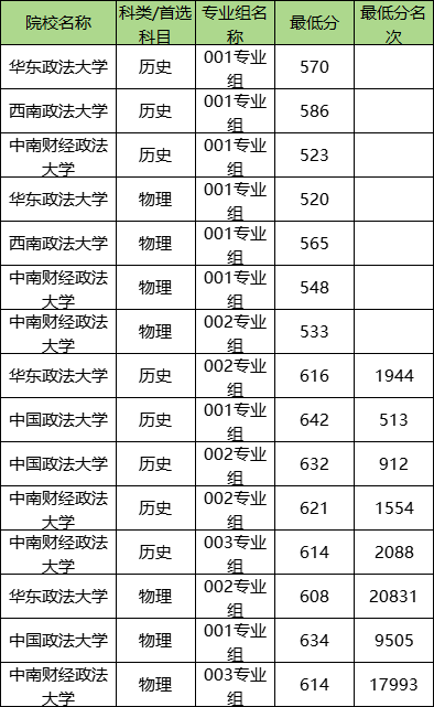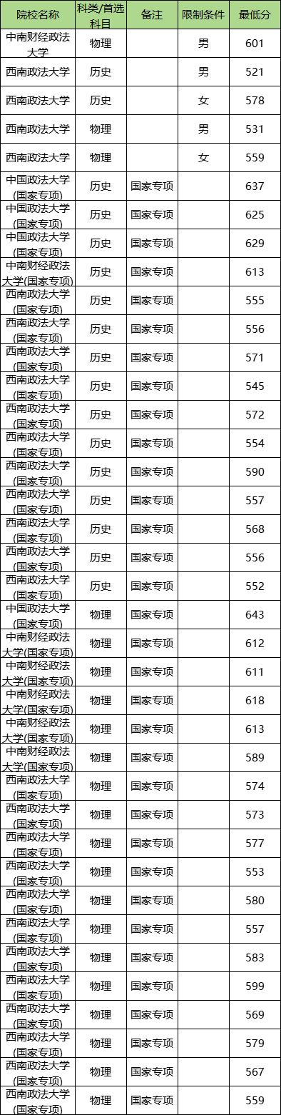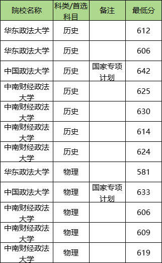 在历史类方面,报考难度最大的是中国政法大学(国家专项),录取线是637分。最好考的学校是西南政法大学,分数是521分。