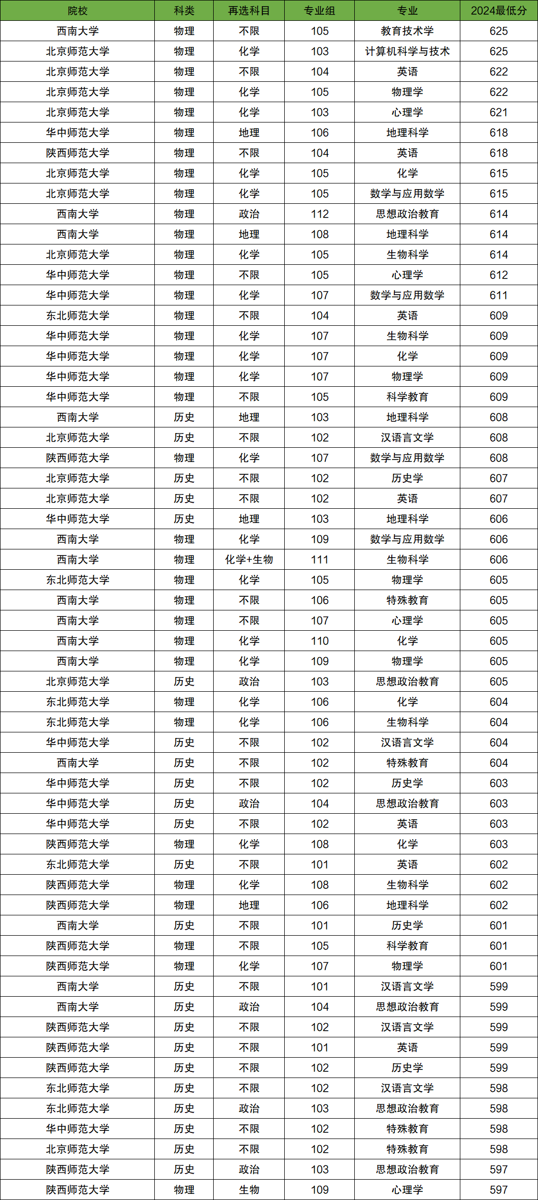 有东北师范大学(历史类最低598分)、华中师范大学(历史类最低598分)、北京师范大学(物理类最低614分)、陕西师范大学(历史类最低597分)等。