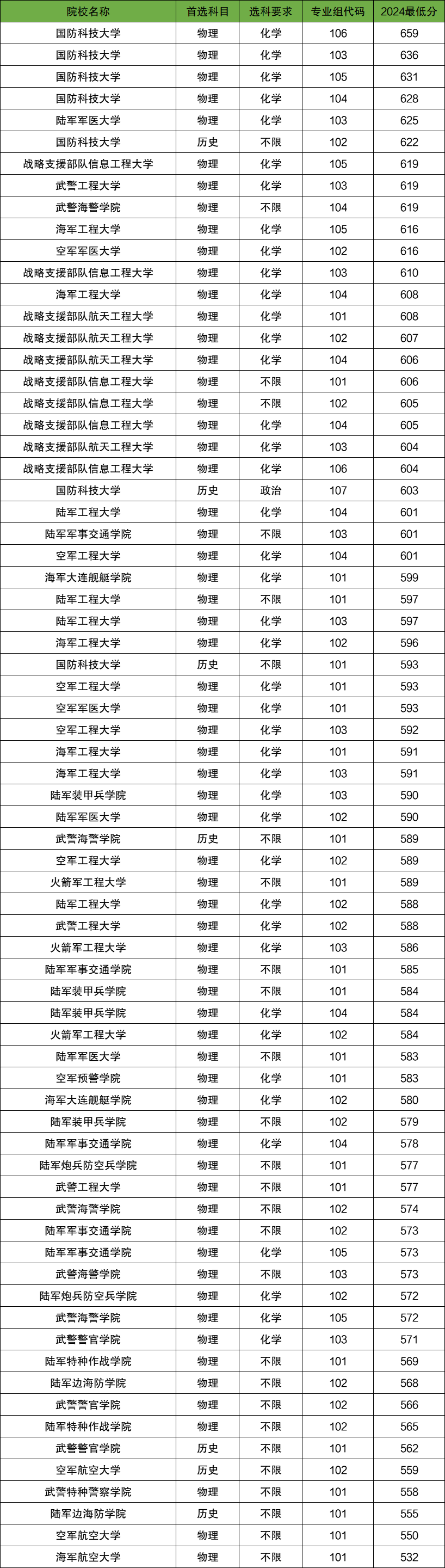 军校有国防科技大学(物理类最低628分)、陆军军医大学(物理类最低583分)、武警警官学院(历史类最低562分)、海军工程大学(物理类最低591分)等。