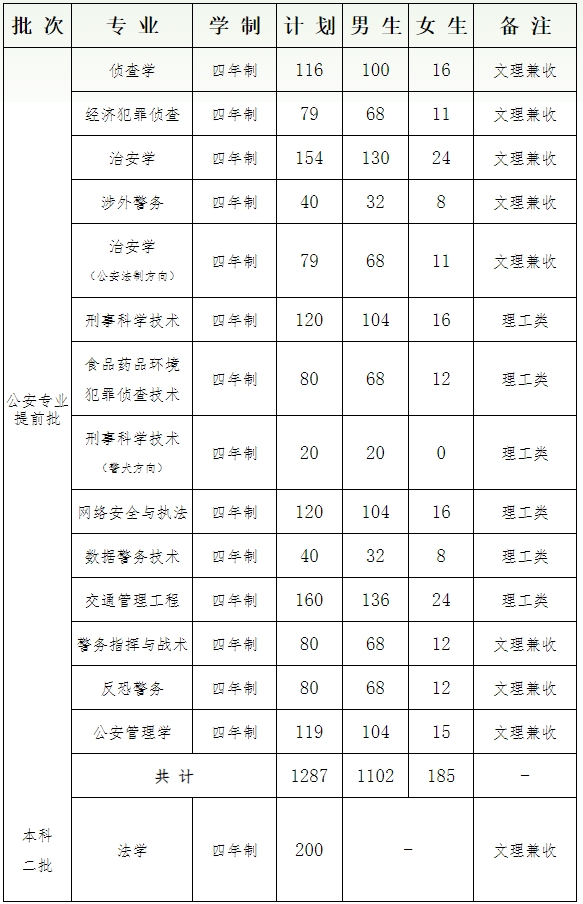 2024河南警察学院面向本科计划招生人数为1487人,包含公安专业总数1287人,非公安专业总数200人(法学专业)。