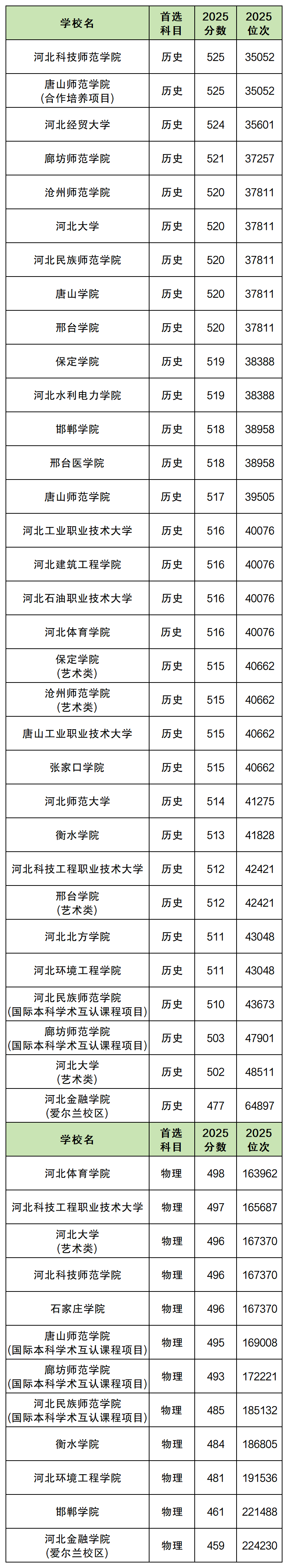 注:新高考省份录取批次不区分一本、二本,本文将本科批特控线以下的非双一流大学视为二本院校,2025年河北特控线:历史类527分、物理类499分。