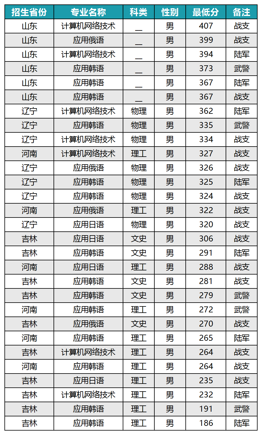 学校的应用韩语专业,在面向男生招生的最低分是186分(吉林省,陆军定向);