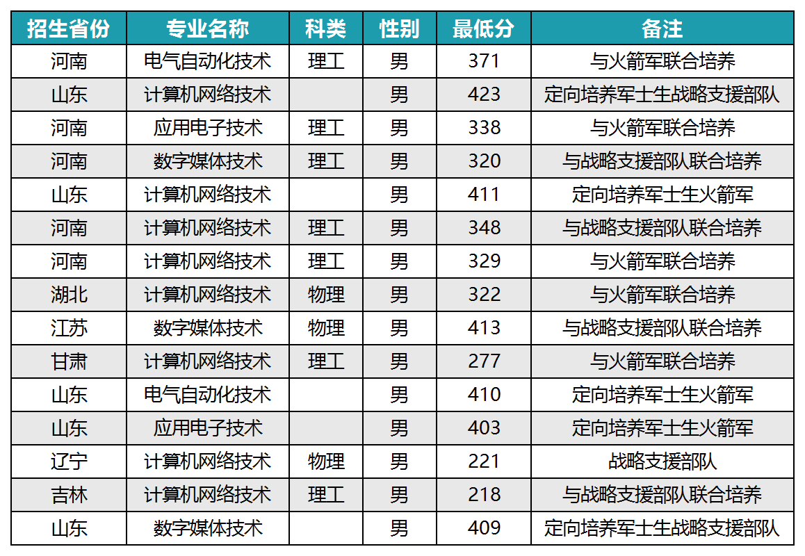 学校的电气自动化技术专业在河南和山东招生,山东最低分是371分(与火箭军联合培养),河南最低分是410分(定向培养军士生火箭军)。