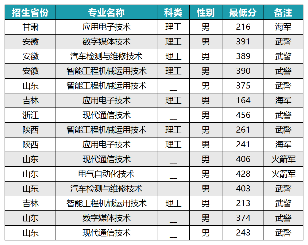 学校的应用电子技术专业在3地招生,分别是甘肃216分(定向海军)、吉林249分(定向海军)、陕西316分(定向海军)。