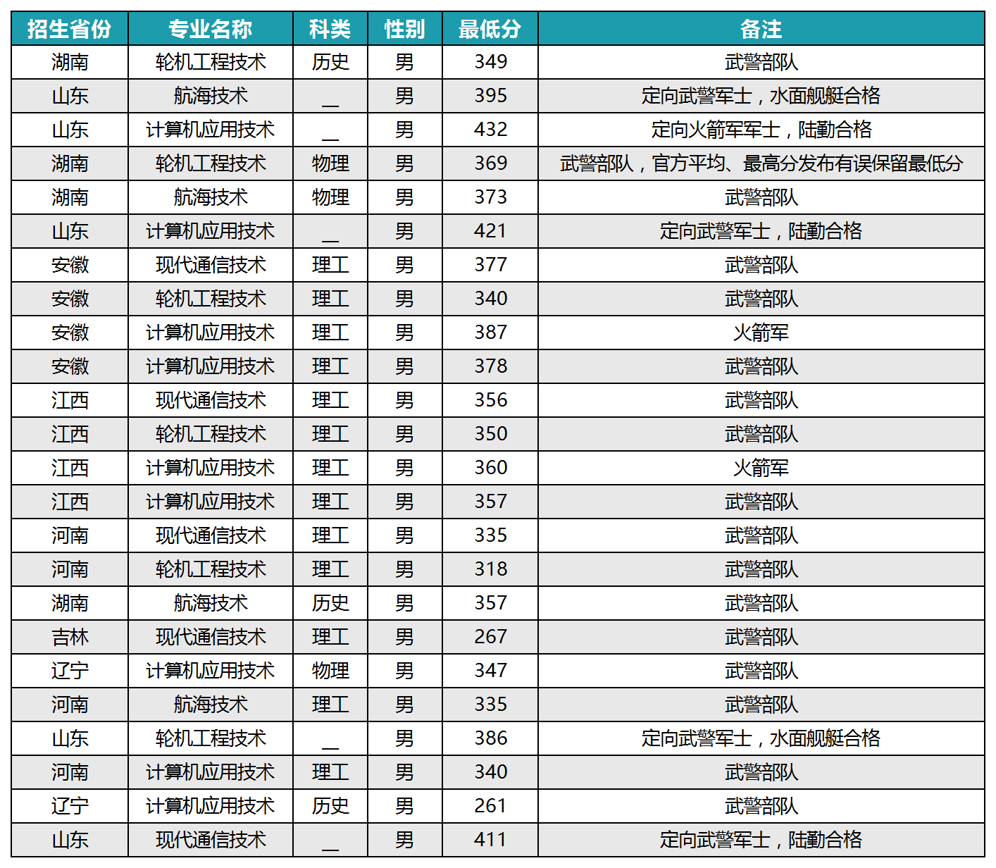 学校的航海技术专业在山东、湖南和河南3地招生,均为男生。其中山东的最低录取分数为395分(定向武警军士),湖南物理类最低分为373分,历史类为357分(定向武警部队)。
