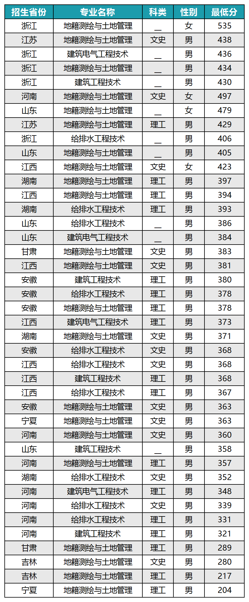 男生想要进入这所学校,至少需要达到204分的分数要求。对于理工类考生而言,宁夏、吉林、甘肃这三个地区的地籍测绘与土地管理专业的分数线都在290分以下。而对于文史类考生来说,该校的给排水工程技术专业最低录取分数为339分,招生地区为河南省,其他三地的专业分数线则在350分以上,例如湖南352分、江西368分、安徽368分。