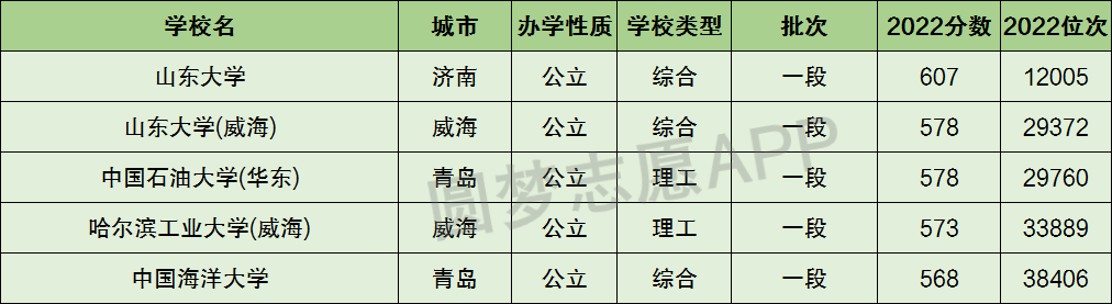 以下为哈尔滨工业大学(威海)、山东大学、中国海洋大学、中国石油大学(华东),2022年在山东省的最低分数线