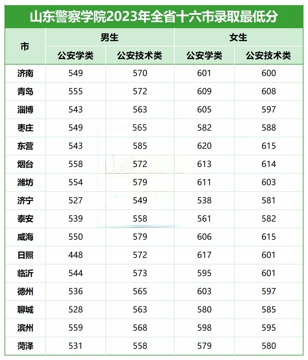 每年来看,山东警察学院的女生分数线都比男生高出不少,今年也不例外。同样为济南市的考生,男生报考公安学类专业最低需要549分,而女生则需要601分。此外,由于学校在不同地市的招生计划不同,招录分数同样也有较大出入。