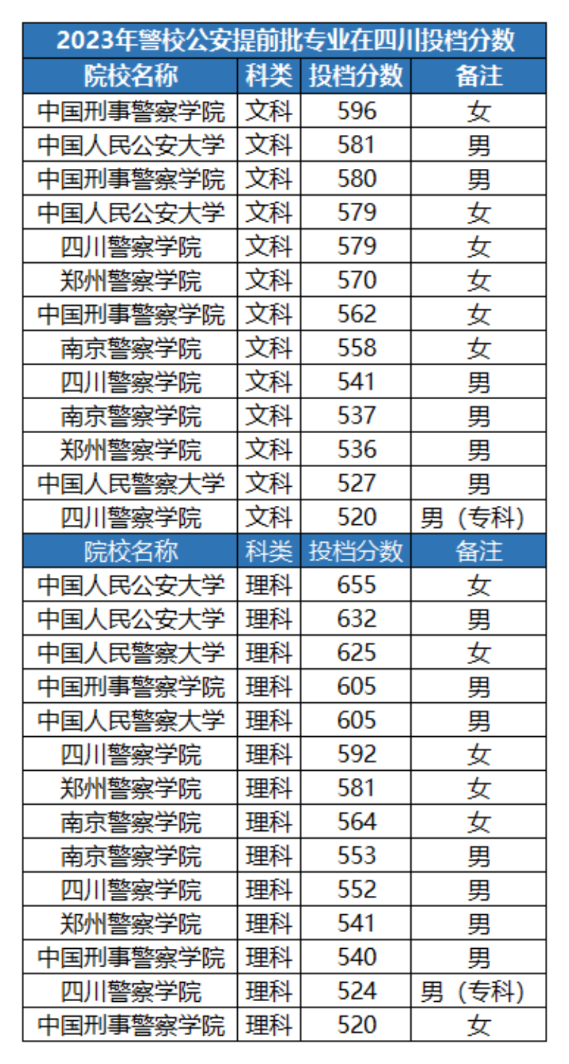 2023年文科男生最低需要520分才能报考警校,对应院校是在专科提前批招生的四川警察学院(警犬技术),女生则需要558分;