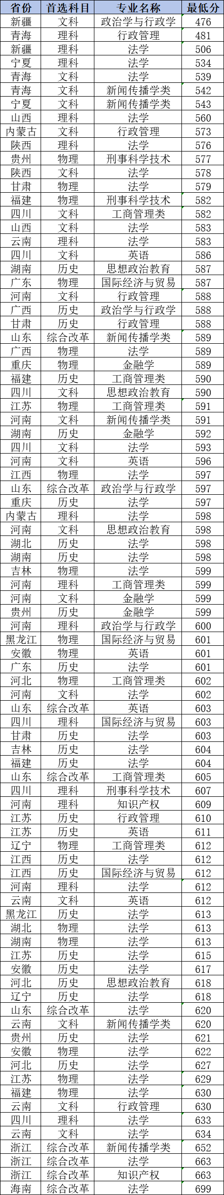 2024年西南政法大学高校专项计划各省录取最低分一览表:
