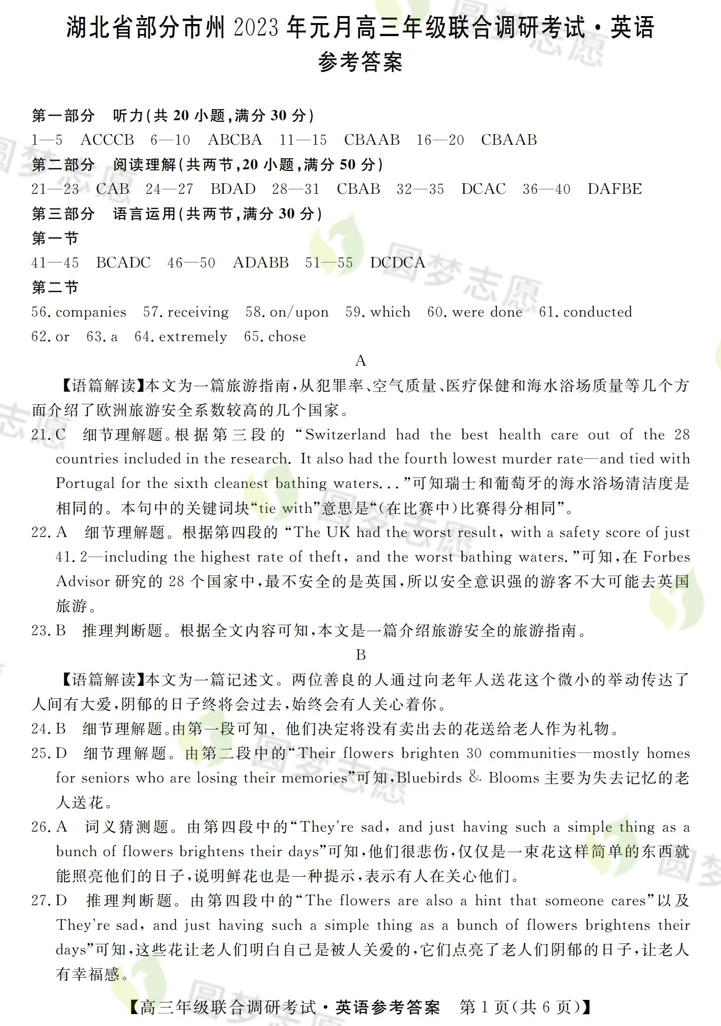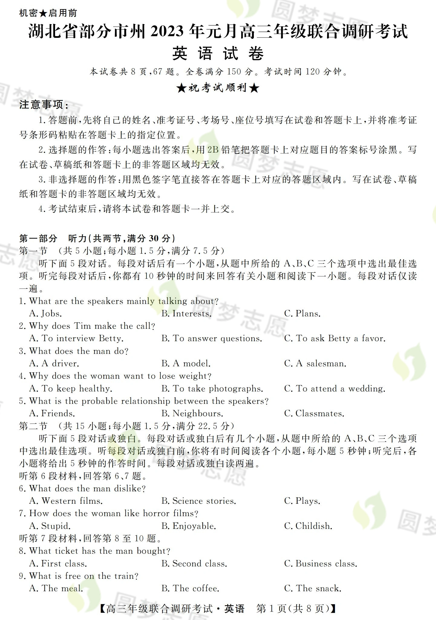 2023湖北部分市州高三年级联合调研考试将于2023年1月9日开考,考试结束后本文将更新2023湖北部分市州高三年级联合调研考试英语答案及试卷,下文为小编搜集整理的2023湖北高三元月调考英语试题及参考答案,供大家参考。