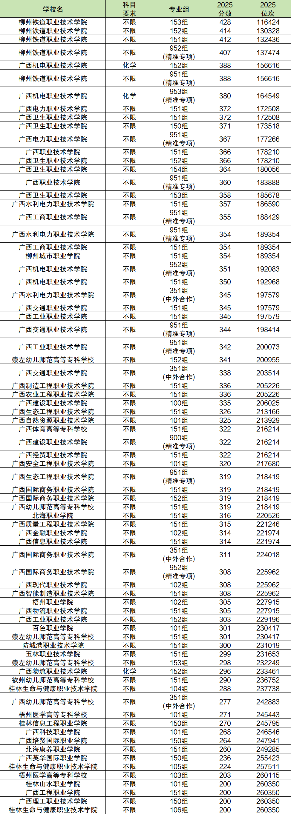 按照2025年录取分数线从高到低排序,为大家展示了广西专科大学录取分数线排名,可查阅: