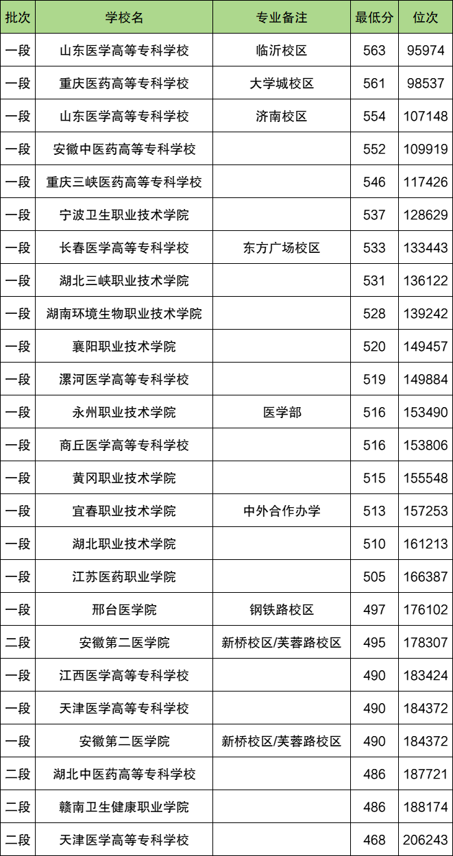 而低于500分能上的只有三所,分别是:湖北中医药高等专科学校486分、赣南卫生健康职业学院486分、天津医学高等专科学校468分,均为二段录取。