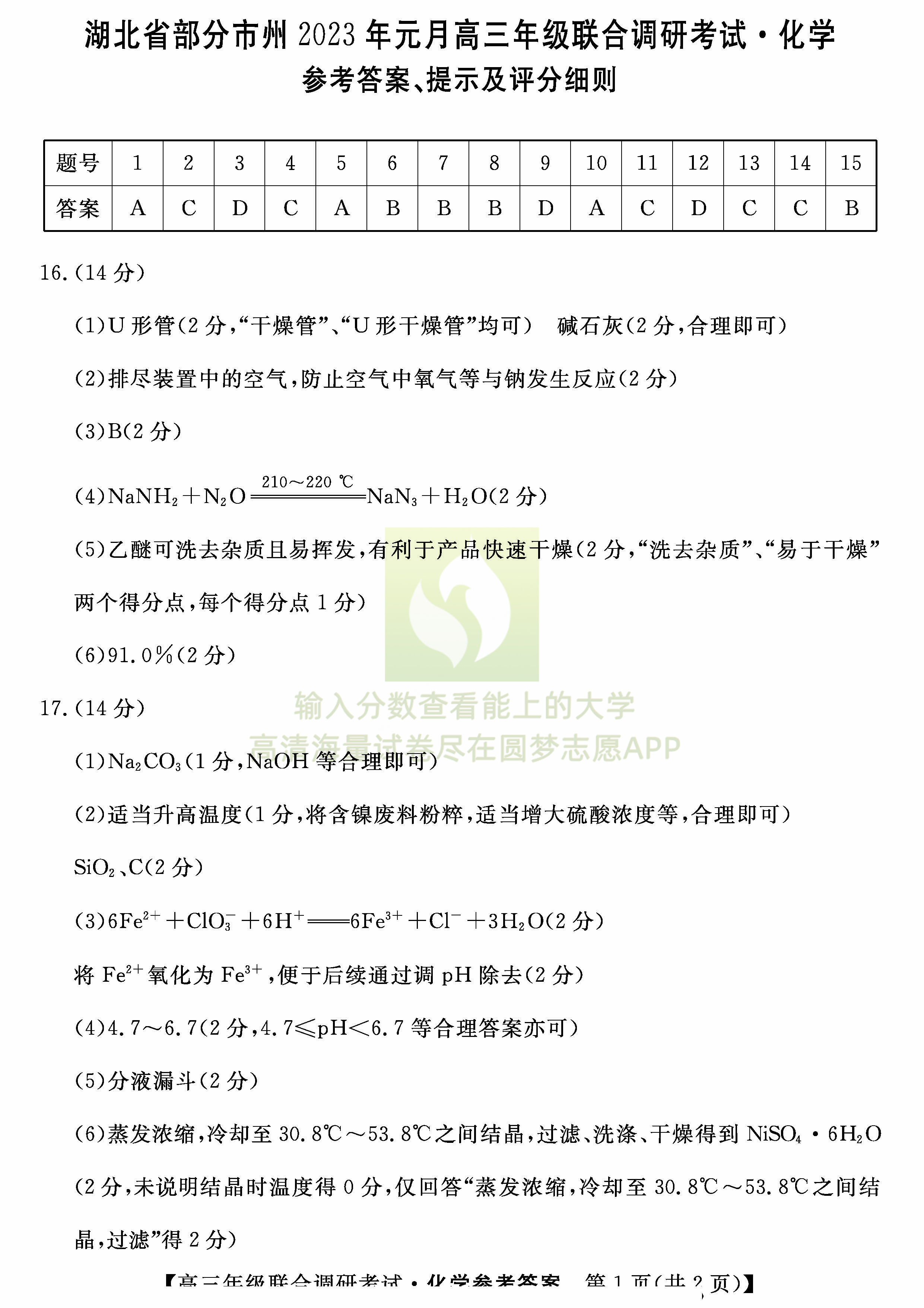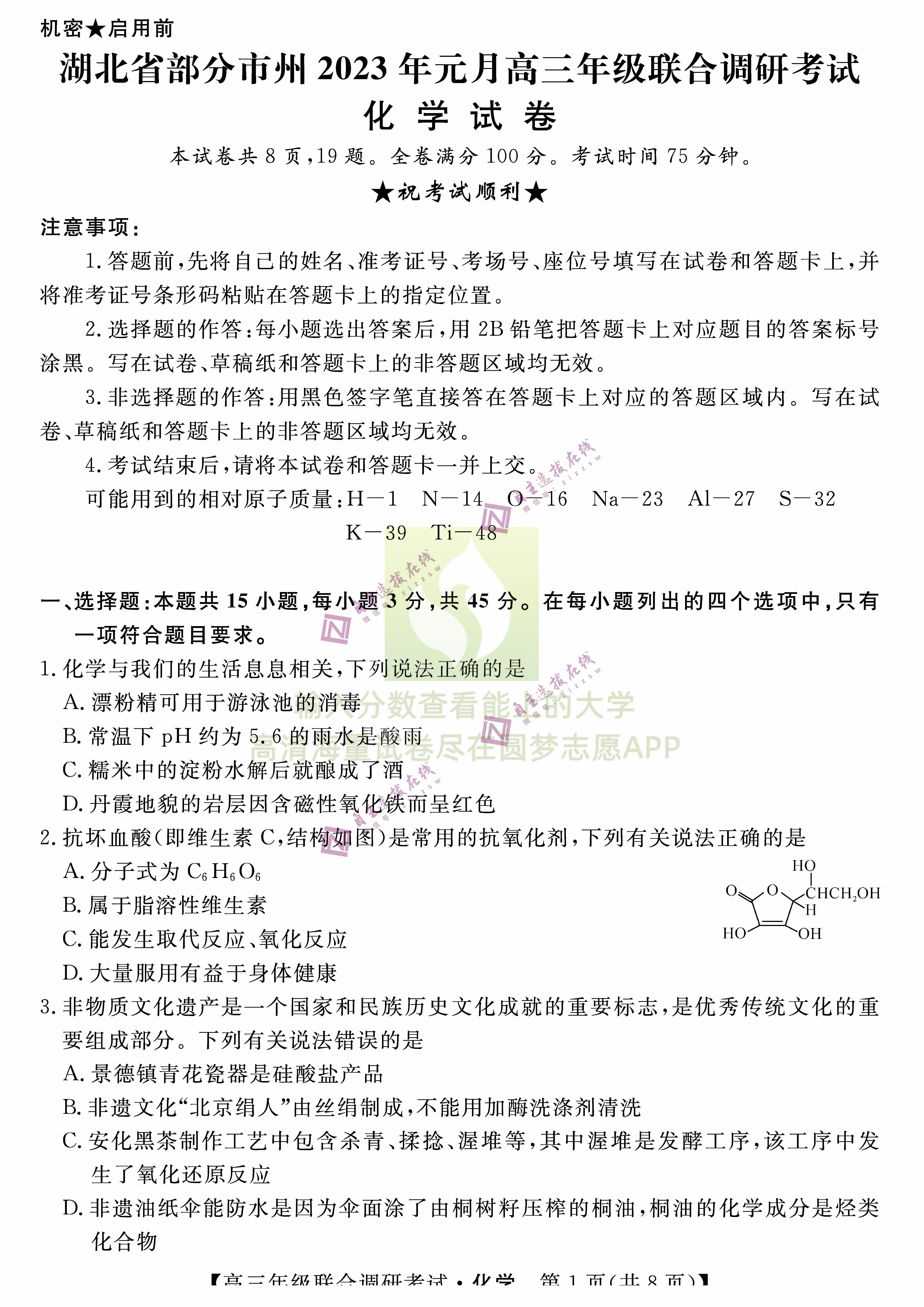 2023湖北部分市州高三年级联合调研考试将于2023年1月9日开考,考试结束后本文将更新2023湖北部分市州高三年级联合调研考试化学答案及试卷,下文为小编搜集整理的2023湖北高三元月调考化学试题及参考答案,供大家参考。