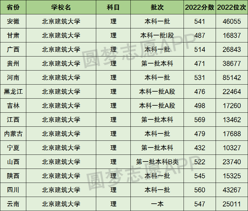 1、北京建筑大学在全国普通高考省份的【理科】招录数据,包含招生批次等信息: