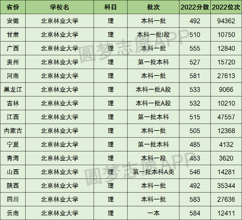 2、北京林业大学在全国普通高考省份的【理科】招录数据,包含招生批次等信息: