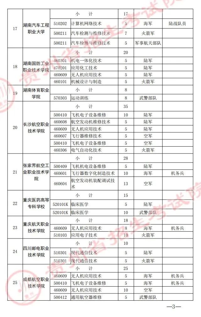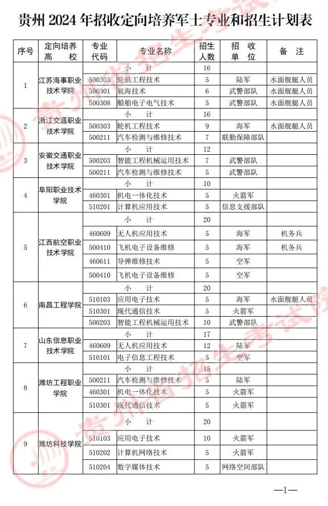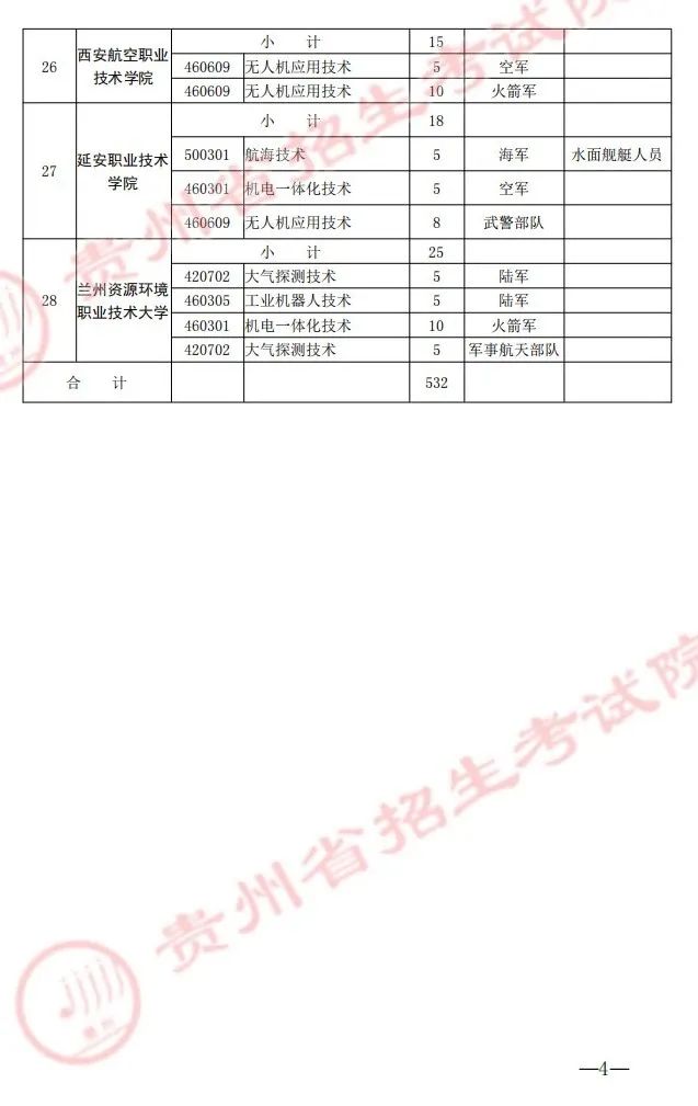 在贵州专科提前批招收定向培养军士的学校有28所,招收532人(含女军士4人)。