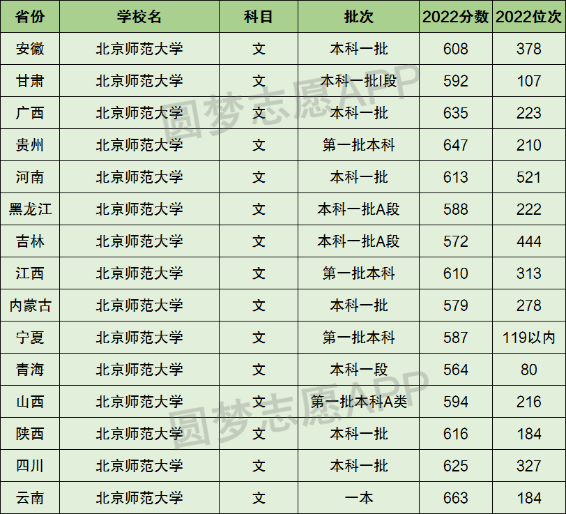 1、北京师范大学在全国普通高考省份的【文科】招录数据,包含招生批次等信息: