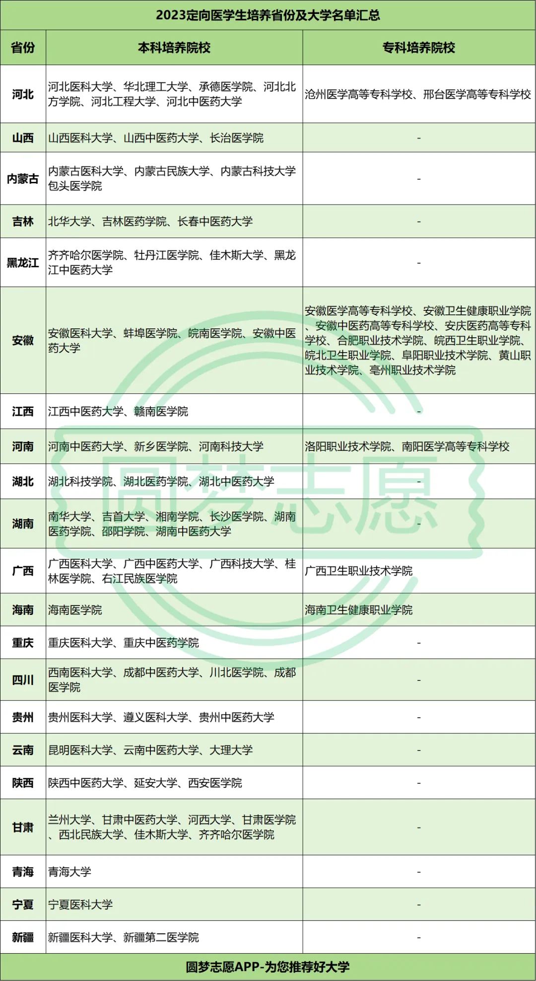 由于目前部分省份2024年定向医学生的招生大学专业还没有公布,老师这里为大家整理汇总了2023年定向医学生招生省份及培养大学,以及部分省份2023年定向医学生各大学招生专业,以供2024年考生参考,具体如下: