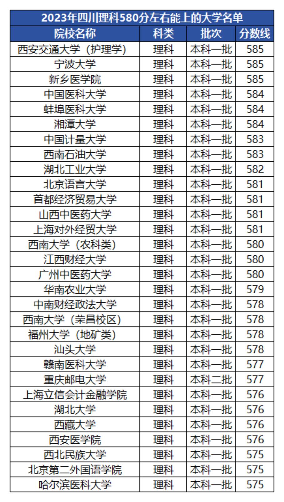 2023年四川理科高考580分左右(575-585分)的考生不仅可以报考宁波大学(585分)、湘潭大学(584分)、西南石油大学(583分)等双一流高校;还可以报考西南大学、福州大学、西藏大学等211大学。