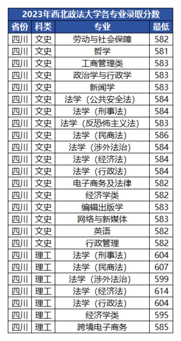根据下文为大家整理的西北政法大学各专业录取分数可以看到,学校大部分专业在四川文科的录取分数保持在580-585分之间,很适合文科高考580分左右的同学报考。