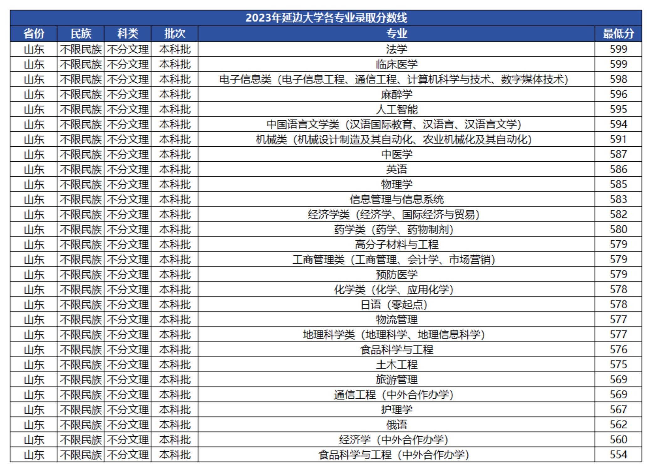 根据下文为大家整理的延边大学各专业录取分数可以看到,除了法学、临床医学、电子信息类专业外,学校大部分专业在山东综合类录取分数保持在560-590分之间,很适合山东综合类高考580分左右的同学报考。