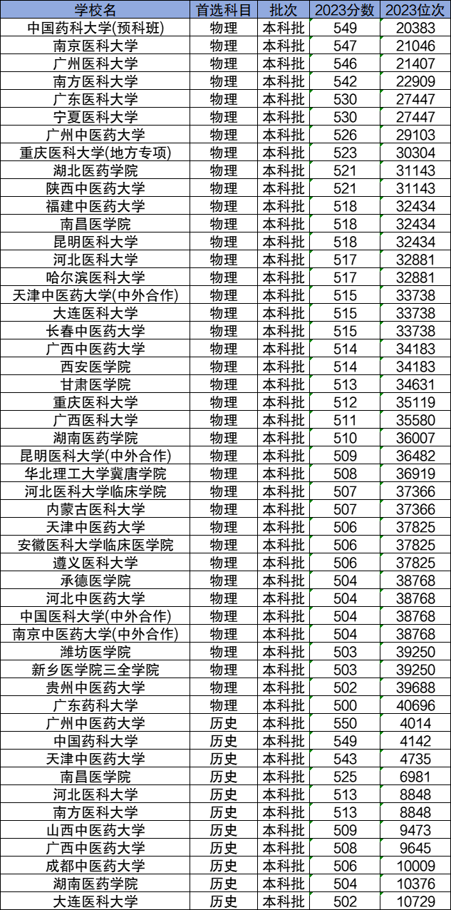 广州中医药大学,2023年最低分在550分,最低位次为4014;中国药科大学,2023年最低分在549分,最低位次为4142。