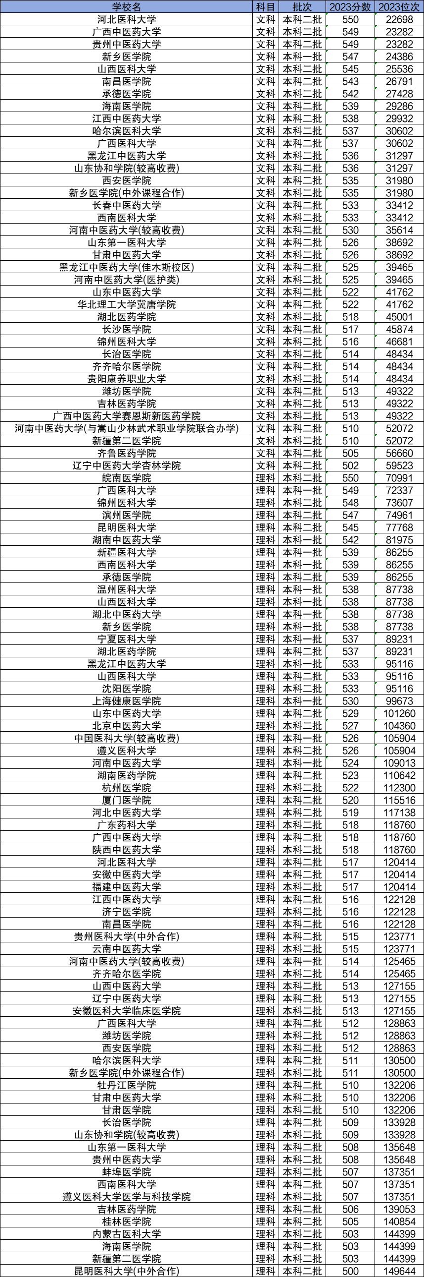 河北医科大学,2023年最低分在550分,最低位次为22698;广西中医药大学,2023年最低分在549分,最低位次为23282。