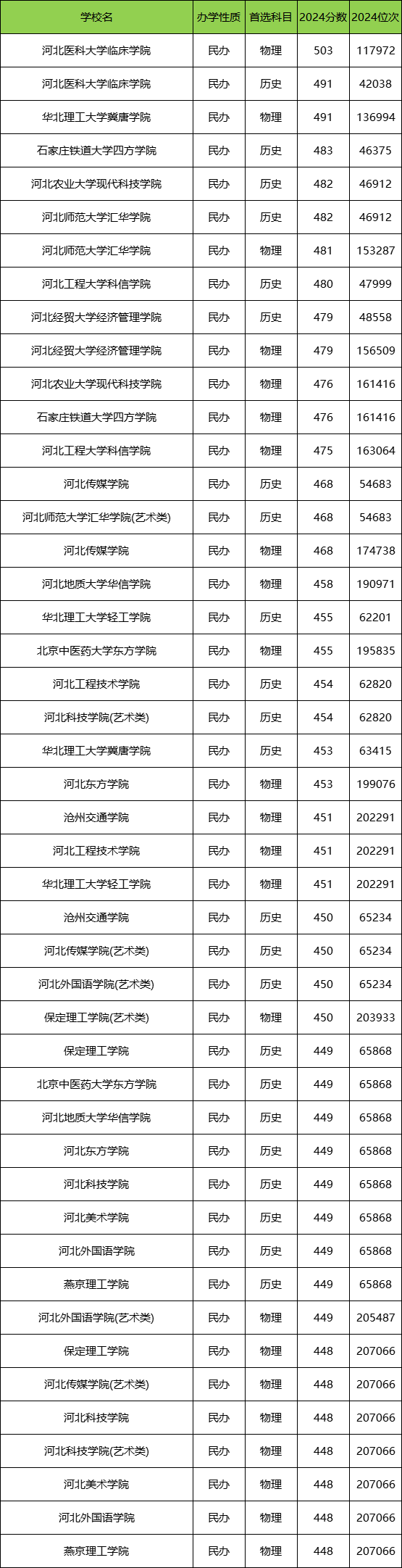 我们以河北本科学校在河北本省2024年招生的分数线为例,我们可以通过数据看看分数高、分数低的本科都有哪些。