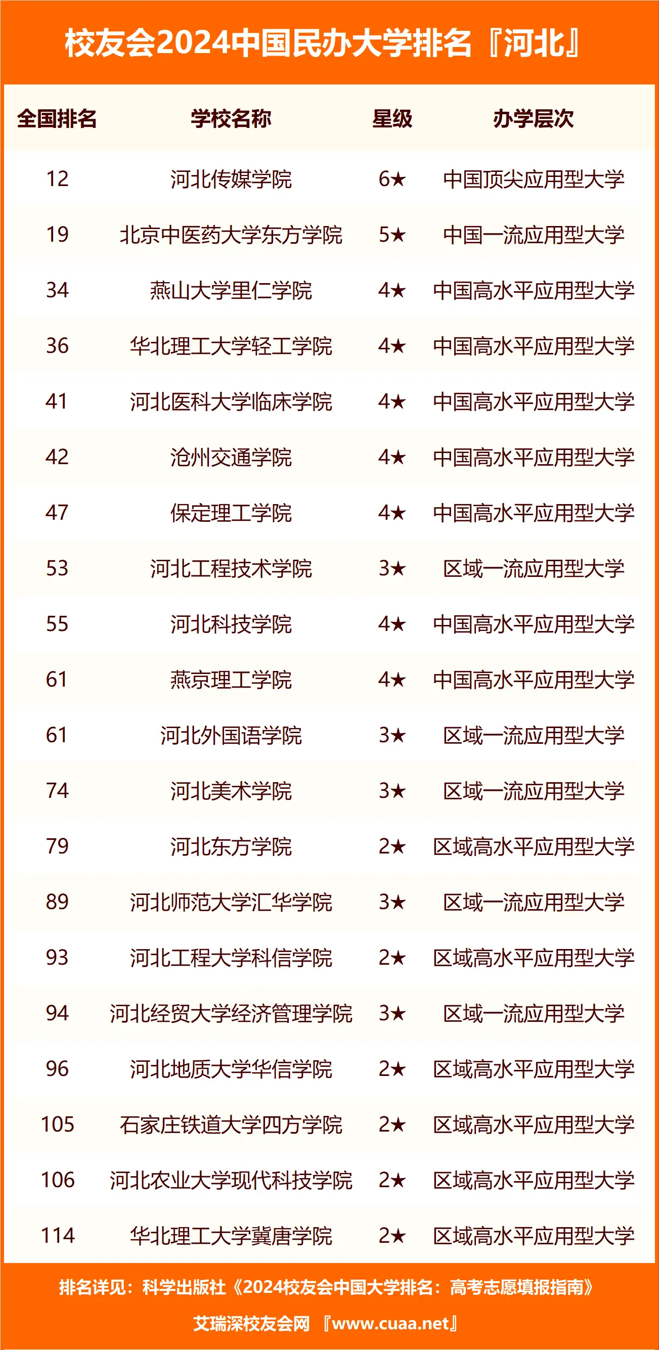 我们从校友会官方获取到了2024年全国本科院校的排名情况,同时我们为大家整理了2024年所有河北本科院校的排名数据如下: