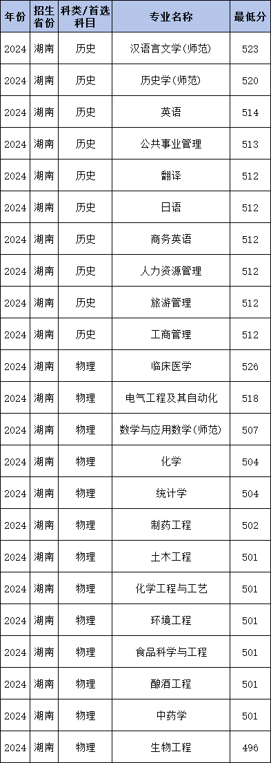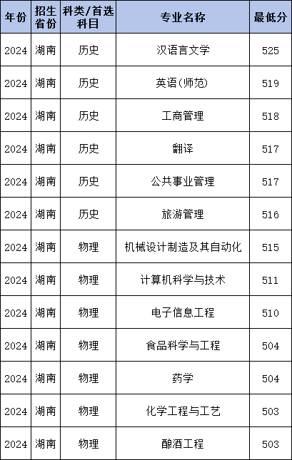 2024年吉首大学国家专项计划在湖南录取最低分历史类为516分、物理类为503分,历史组收分最低的专业为旅游管理、物理组收分最低的专业为化学工程与工艺和酿酒工程。