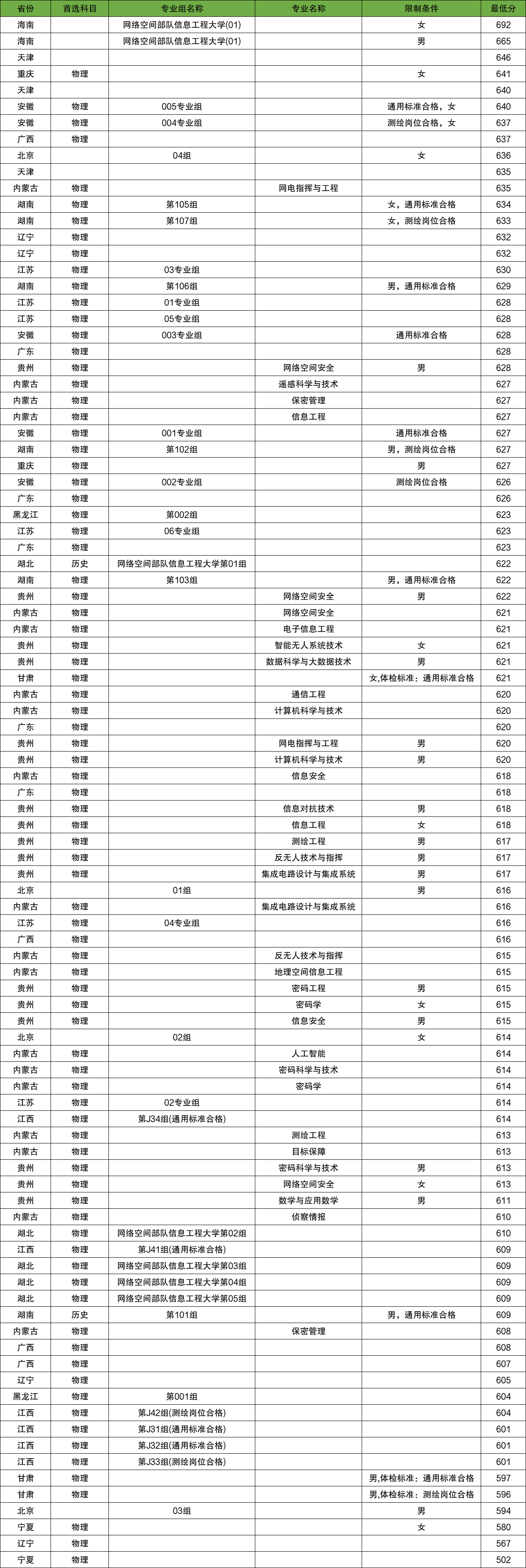 以下是网络空间部队信息工程大学在部分省份的录取分数线汇总: