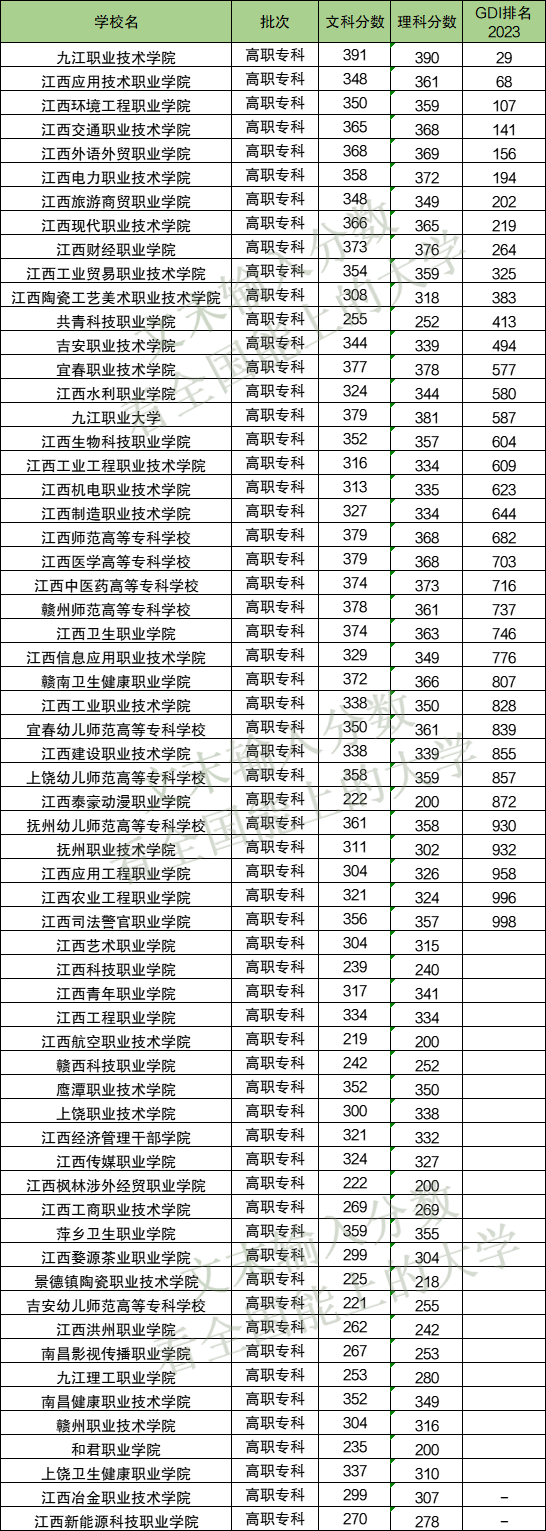 下表为江西省所有专科学校分数线及全国排名。