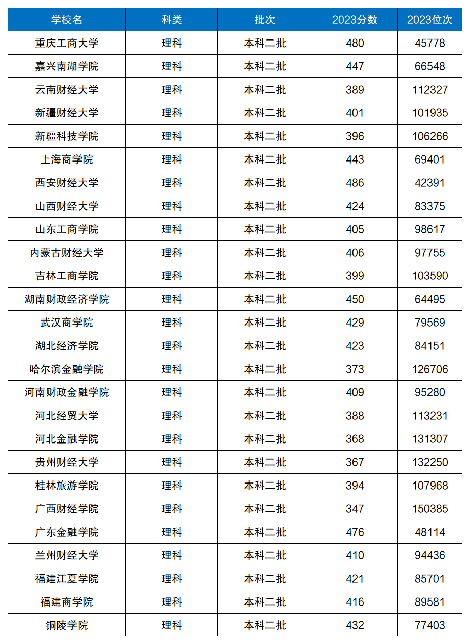 2023年在广西理科招生的二本公办财经院校有山西财经大学、上海商学院、广东金融学院等,整体收分在340分以上,相对较低。