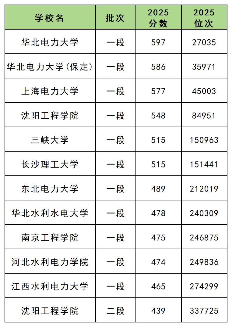 2025年电力大学最低分数线439分,对应收分最低的学校是沈阳工程学院,想要上电力,考生省排名需达到337725左右。