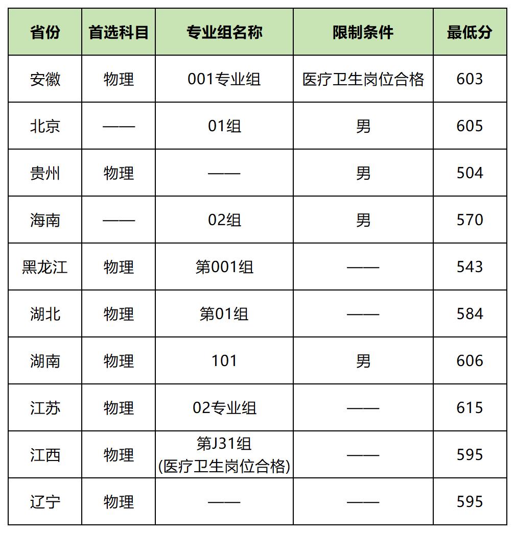 2025年海军军医大学在安徽招生最低分为603分(物理类);