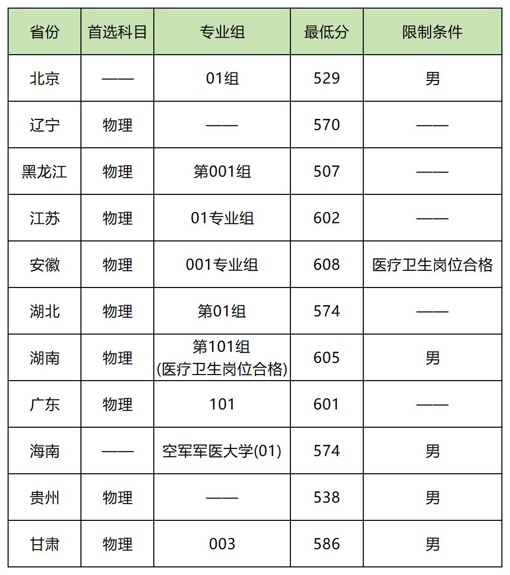 2025年空军军医大学在黑龙江招生最低分为507分(物理类);