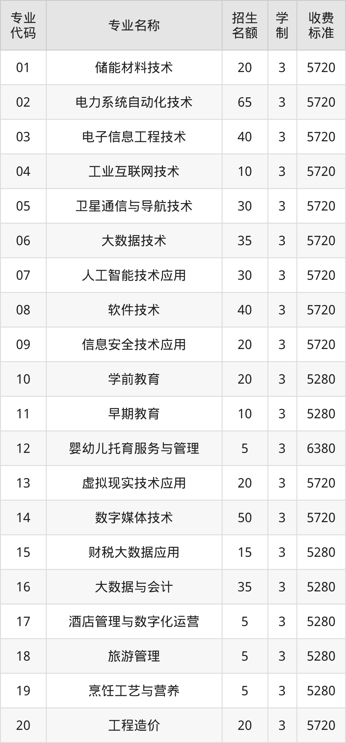 | 专业 代码 | 专业名称 | 招生 名额 | 学 制 | 收费 标准 |