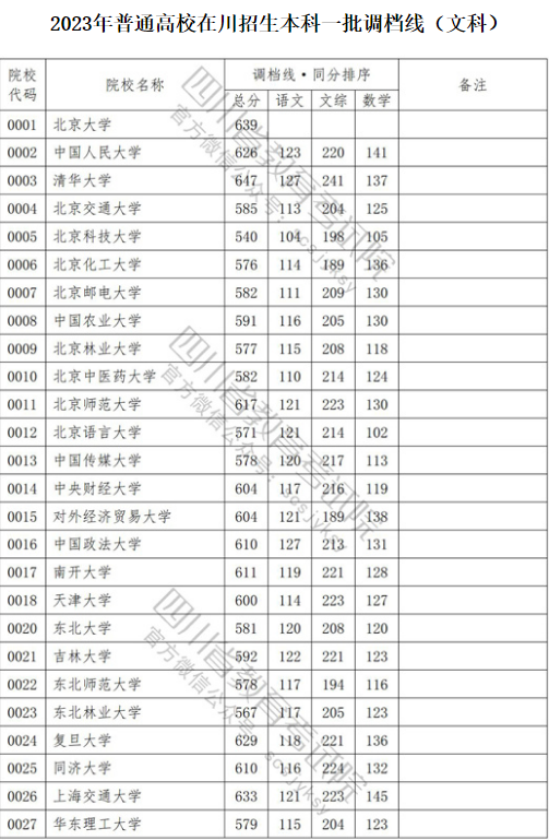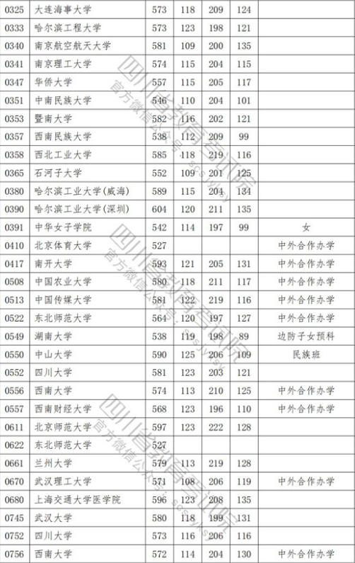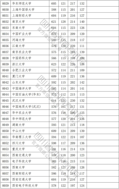 北京大学639分、中国人民大学626分、清华大学647分、南开大学611分、天津大学600分、东北大学581分、中国政法大学610分、北京中医药大学582分、复旦大学629分、同济大学610分、上海交通大学633分、华东理工大学579分。