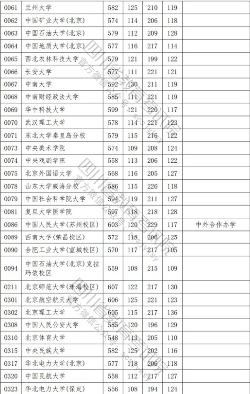 北京大学698分、清华大学698分、中国人民大学679分、北京交通大学633分、中国农业大学628分、中国传媒大学612分、中央财经大学643分、北京师范大学649分、北京邮电大学650分、复旦大学684分、上海交通大学695分。