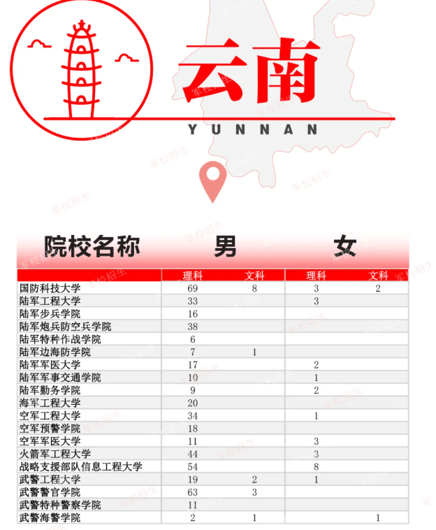 2024年面向云南招生的军校有19所,包含国防科技大学、陆军工程大学、陆军炮兵防空兵学院、陆军军事交通学院、空军军医大学、空军预警学院、武警工程大学、武警警官学院、武警海警学院、战略志愿部队信息工程大学、海军工程大学以下是这19所军校在理科和文科分别招生的人数,详情如下: