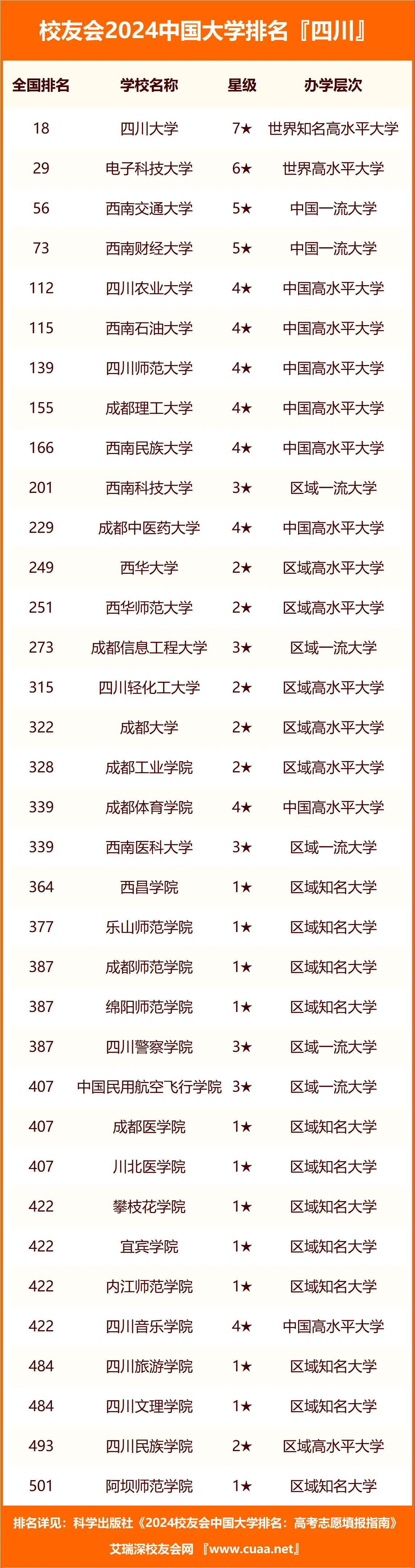 我们从校友会官方获取到了2024年全国本科院校的排名情况,同时我们为大家整理了2024年所有四川本科院校的排名数据如下: