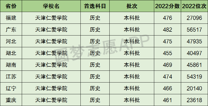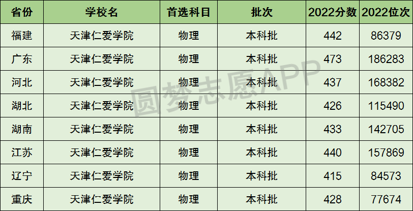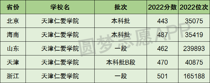 下面圆梦志愿将为大家展示天津仁爱学院2022年在全国各省市的最低分数线和位次,大家可以在了解天津仁爱学院在全国各省详细招生批次的同时,也顺便看看天津仁爱学院的招生录取分数线是多少!
