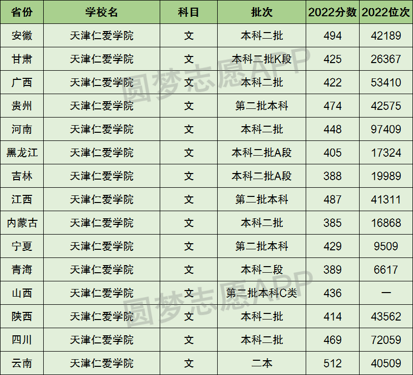 1、天津仁爱学院在全国普通高考省份的【文科】招录数据,包含招生批次等信息: