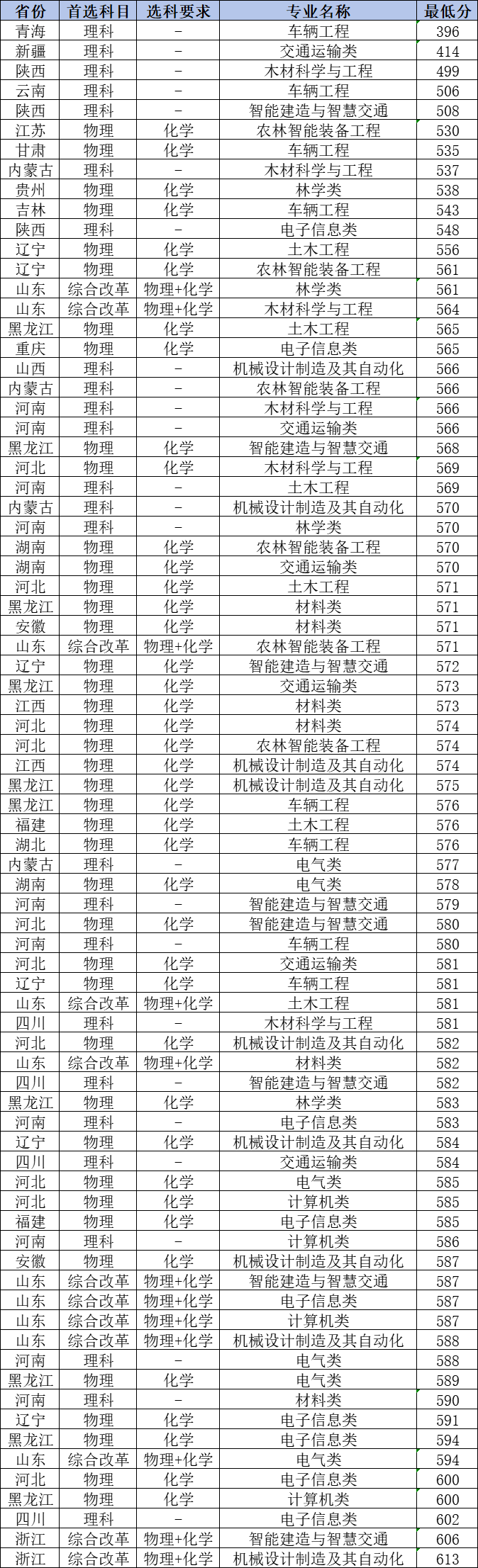 2024年东北林业大学高校专项计划各省录取最低分一览表: